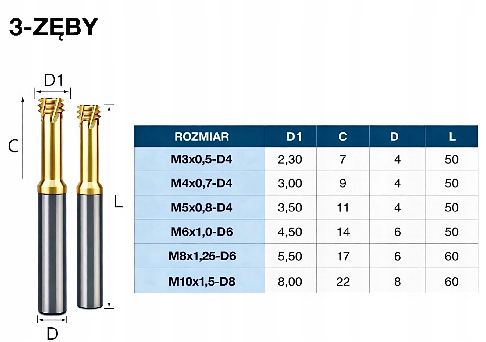 Frez do gwintów M3 x 0,5 węglik 60 HRC stal stal nierdzewna 3 zęby Kod producenta Frez do gwintów M3 x 0,5 węglik